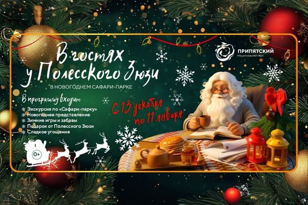 С 13 декабря по 11 января окунитесь в новогоднюю сказку и волшебства в поместье Полесского Зюзи. В новогодней программе Вас ждет: Знакомство с Полесским Зюзей – Полесским Дедом Морозом, его красавицей Внучкой и сказочными персонажами; Экскурсия по «Сафари-парку» - парку диких животных, где Вы встретите ланей, оленей, кабанов, лосей и зайцев; Посещение домика Лесного Кудесника , древнего городища и поляны желаний со скульптурами славянских языческих Богов; Небольшое приключение во владениях Бабы Яги и Кикиморы; Знакомство с Лесовиком и его подсобным хозяйством: ручными оленями, полесскими лошадками, носухами, нутриями, барашками, кроликами, павлинами, фазанами, декоративными курами, гусями, индюшками; Необыкновенно красивая новогодняя елка, танцы, песни, конкурсы, игры, хороводы и сюрпризы от Полесского Зюзи и Внучки; Изысканные угощения и горячие напитки в Карчме Полесского Зюзи; Оборудованные кострища, где Вы сможете пожарить сало или запечь картофель на углях; Памятные подарки и сувениры от Полесского Зюзи; Большая ледяная горка с ватрушками; Сувенирная лавка; Фотосессия со сказочными персонажами.Примечание: В поместье установлен специальный почтовый ящик для писем к Зюзе. Все желающие могут написать письмо с заветными желаниями, а самые любопытные могут познакомиться с Полесским Зюзей , заранее записавшись на личный прием.Продолжительность: 2,5 - 3 часа. Стоимость билета: детский – 30,00 руб., взрослый – 35,00 руб. Индивидуальное посещение поместья Полесского Зюзи для детей и взрослых – 25 руб.В стоимость билета входит: Экскурсия по «Сафари-парку» Новогоднее представление Подарок от Полесского Зюзи Сладкое угощение в «Карчме» Катание на ватрушках Корм для животныхНачало программы в будние дни для групп: 10:00, 12:00, 14:00, 15:00 для семей: 12:00, 15:00Начало программы в выходные дни для групп: 10:00, 12:00, 14:00, 16:00 для семей: 11:00, 15:00